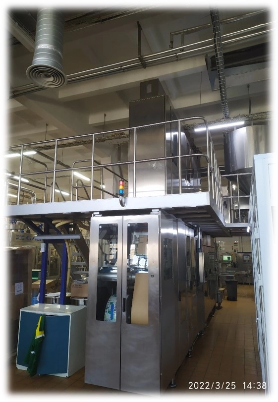 - Узел перекисной обработки упаковочного материала. Обработка упаковочного материала перекисным раствором концентрации 2.7% с последующей сушкой УФ лампой высокой интенсивности.