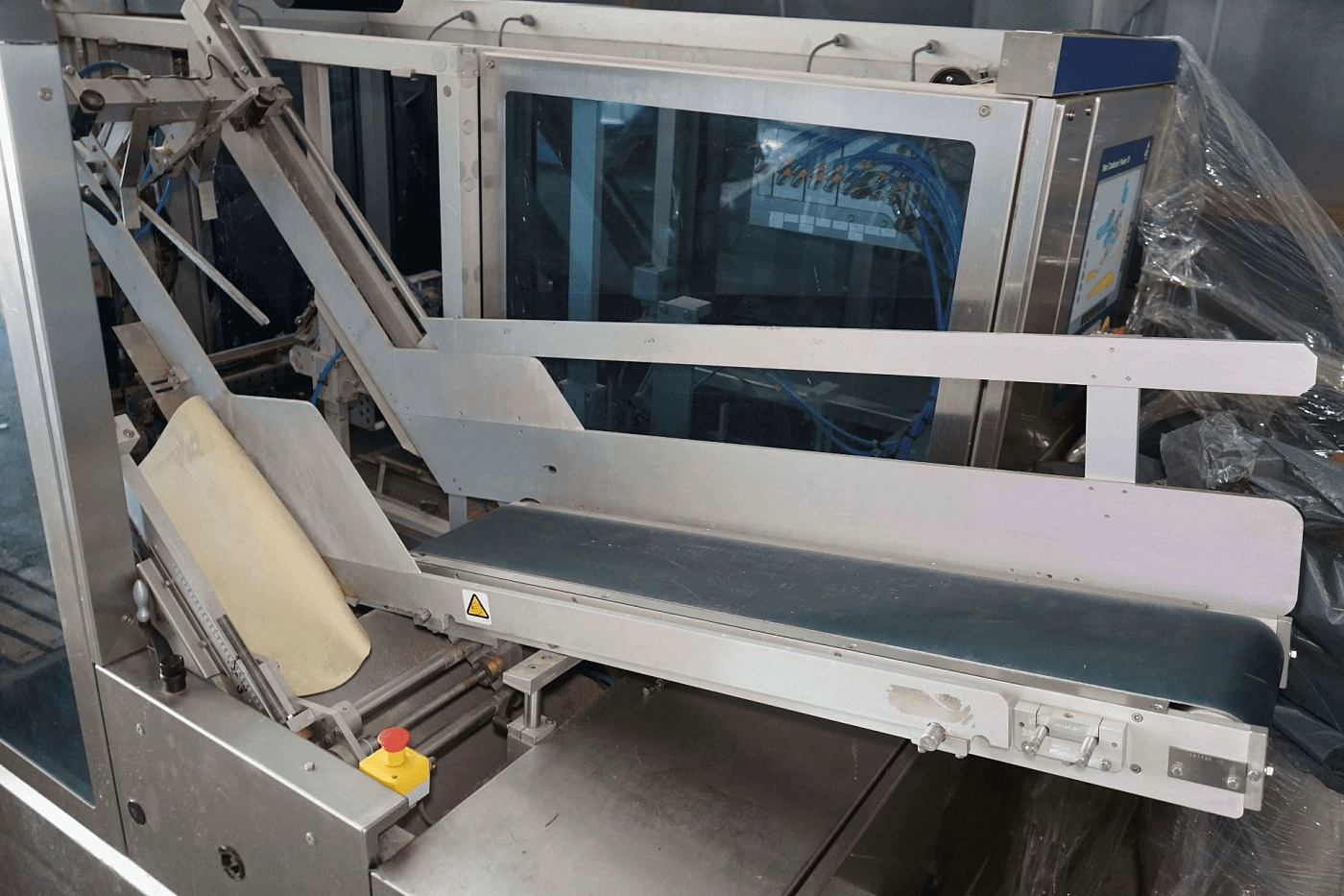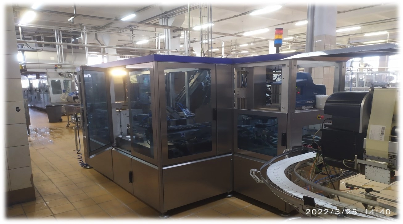 - Элеватор крышек. Подача и ориентация крышек до подводящего желоба. Устройство навинчивания крышки. Имеет устройство состоящее из двух ремней с разной скоростью, благодаря чему происходит навинчивание крышки на пакет. Устройство с контролем крышки и отбраковщиком пакетов без крышек. Конвейерная система. Обеспечивает накопление до 2-ух минут без остановки автомата.